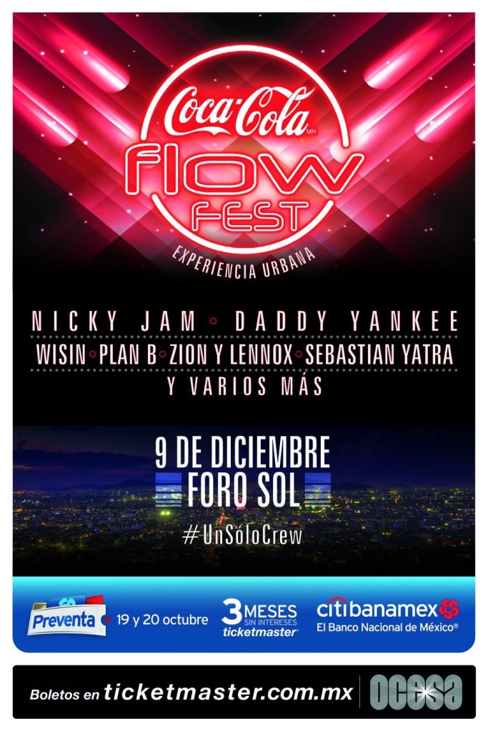 Coca-Cola te invita a ser parte de la mejor fiesta del momento donde los máximos exponentes de la música urbana se reunirán en un concepto único bajo el nombre de Coca-Cola Flow Fest. El encuentro de los más grandes intérpretes de éste género reunidos en un mismo sitio para que sus seguidores disfruten de esta nueva experiencia de principio a fin. La cita será el 9 de diciembre en el Foro Sol en donde se alistará el escenario para que Nicky Jam, Daddy Yankee, Zion & Lennox, Wisin, Sebastián Yatra y más por anunciar… amenicen la mejor fiesta y cerrar así éste 2017.
