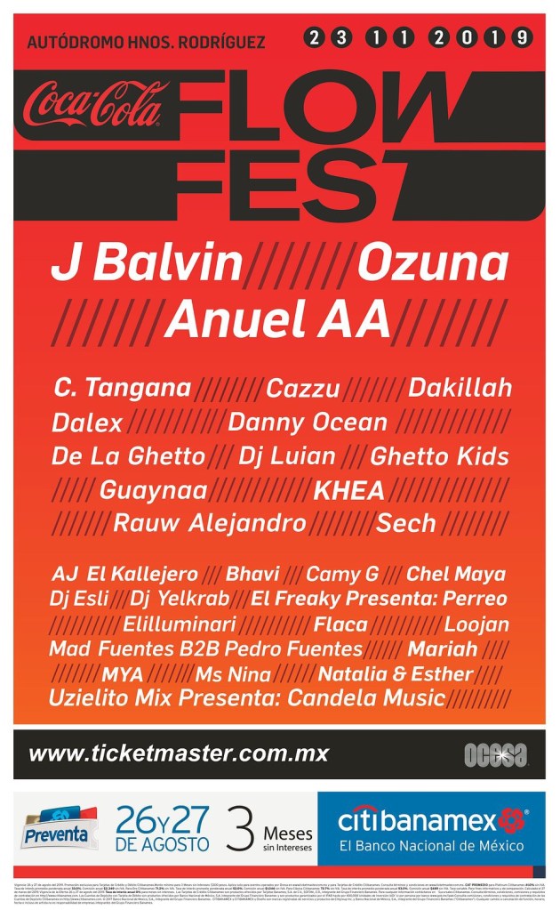 Hoy, OCESA se complace en anunciar que el Coca-Cola Flow Fest, no sólo regresa para consagrarse como el festival más grande de música urbana, sino que crece y se expande para realizarse por primera ocasión en la Curva 4 del Autódromo Hermanos Rodríguez con 3 escenarios, 30 actos, más de 10 horas de música nos esperan el próximo sábado 23 de noviembre de 2019. Sumando la experiencia con zonas de gastronomía, arte urbano, juegos mecánicos y zonas de descanso que harán disfrutar al máximo la fiesta urbana en su tercera edición.
