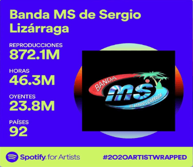 De acuerdo con los reportes anuales de Spotify, la agrupación tuvo en el 2020, 872 millones de reproducciones de sus temas y más de 23 millones de oyentes en 92 países. Cifras que definitivamente no deben de pasar desapercibidas. Otro importante reconocimiento que tuvo la BANDA MS este 2020 fue el haber sido elegida como el primer artista mexicano en aparecer en el “Artist Spotlight”de YouTube, convirtiéndose con ello en el primer artista mexicano en formar parte de esta serie de importantes documentales que son una autentica biblioteca de música internacional. (Artist Spotlight YouTube).