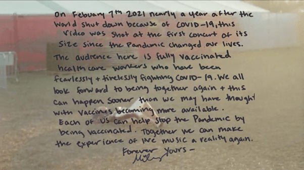 Este video musical muestra la actuación de Miley en su primer show en vivo desde que inició la pandemia, cumpliendo con los parámetros establecidos del COVID-19, que tuvo lugar en Estados Unidos el pasado 7 de febrero. La audiencia estuvo conformada por trabajadores de la salud completamente vacunados, que son personas que han luchado de manera muy valiente e incansablemente en el frente contra el COVID-19. También se podrá observar una nota especial de Miley en el minuto 3:17 contando su experiencia, misma que se encuentra en la captura de pantalla a continuación.
