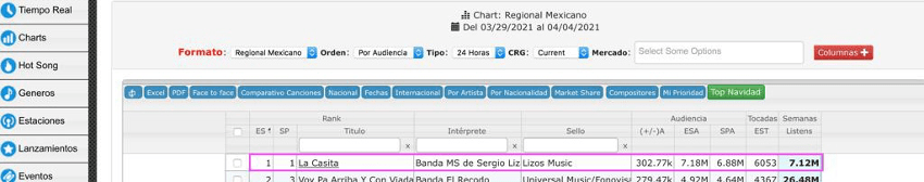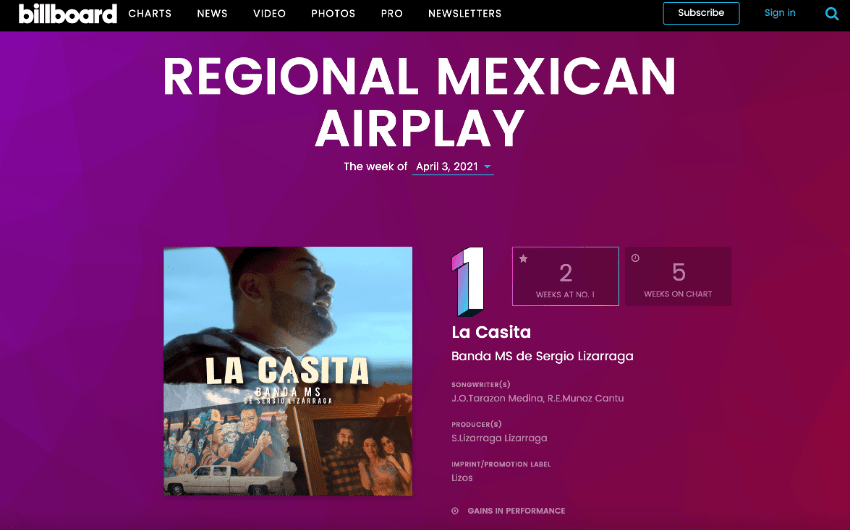 POR SEGUNDA SEMANA CONSECUTIVA “LA CASITA”SE MANTIENE EN EL PRIMER LUGAR DE POPULARIDAD EN REGIONAL MEXICAN AIRPLAY DE LA REVISTA BILLBOARD Y EN EL CHART DE MONITOR LATINO