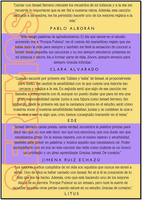 Serrano recorre este viaje con grandes voces del panorama internacional. Tras haber presentado junto a Clara Alvarado y Litus “Porque Fuimos”, primer adelanto de este trabajo y la cumbia madrileña “Fahrenheit 451”, los fans del cantautor ya pueden descubrir todas las canciones del álbum, incluyendo sus colaboraciones con Pablo Alborán, EDE, Jimena Ruiz Echazú. Y “porque fuimos, seremos”, todos ellos han dedicado unas palabras.