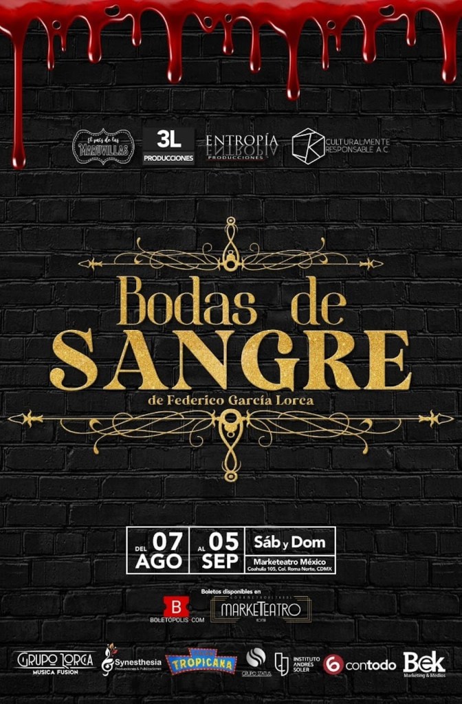 BODAS DE SANGRE tendrá una temporada en Marketeatro Roma, CDMX , del 7 de Agosto al 5 de Septiembre de 2021, con funciones todos los sábados a las 18:30 H. y Domingos a las 17:30 H.