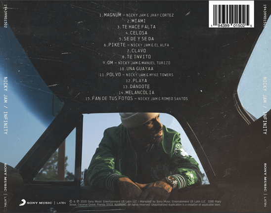 INFINITY es el álbum más versátil de Nicky Jam hasta el momento y lleva al oyente por un viaje a través de todos los géneros que el artista ha dominado a lo largo de su carrera. Comenzando con una explosión, llevando su sonido de reguetón de la vieja escuela a la vanguardia sintiéndose muy actual, el álbum luego retrata todas las diferentes facetas del arte de Nicky, desde los versos de rap crudos y reales, hasta las canciones románticas y melódicas de ritmo lento que realmente muestran su rango vocal.