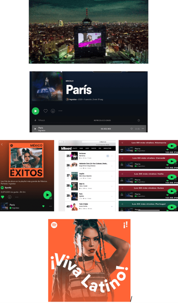 En las últimas semanas el tema “PARÍS” interpretado por INGRATAX ha revolucionado a la industria musical de México y el mundo, a la fecha esta canción reporta más de 56 millones de reproducciones en Spotify y está colocada en los primeros lugres en los charts de éxitos musicales en más de 36 países. El tema sencillamente es un éxito en toda la extensión de la palabra.