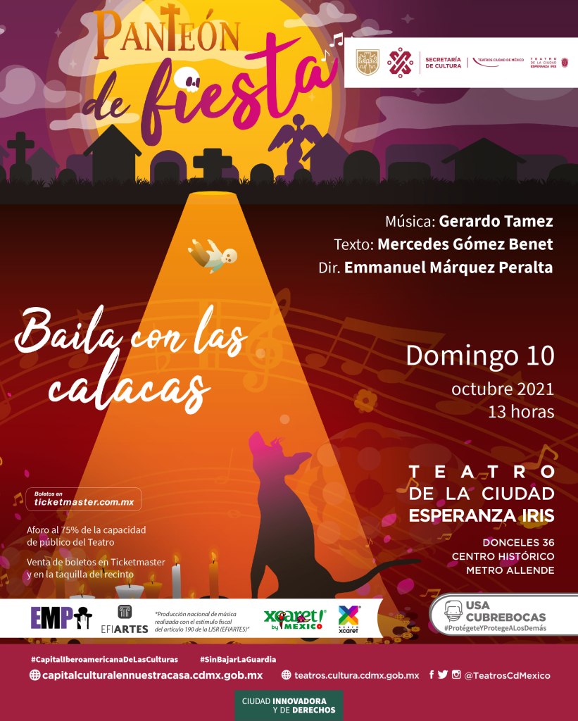 Panteón de fiesta se presentará una única función el domingo 10 de octubre a las 13:00 horas en el Teatro de la Ciudad Esperanza Iris (Donceles 36, Centro Histórico, Metro Allende), con las disposiciones del semáforo epidemiológico vigente: cupo limitado al 75 por ciento de la capacidad del recinto y uso permanente de cubre-bocas, gel anti-bacterial y registro de código QR por parte tanto del personal del teatro como de los espectadores.