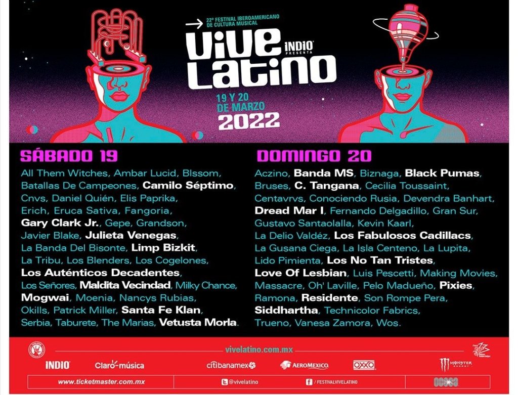 El festival más importante de México y Latinoamérica, Vive Latino, se complace en anunciar su lineup y todas las actividades que girarán en torno a su edición 2022. Con 22 ediciones a cuestas, la máxima fiesta del rock en español comienza su cuenta regresiva para recibir a las distintas tribus urbanas y dar vida a la plancha de concreto del Foro Sol, quien recibirá toda la energía de los miles de melómanos del rock hispano y sus distintas vertientes. La fecha pactada para esta nueva edición será los días 19 y 20 de marzo de 2022. La preventa Citibanamex se realizará los días 13 y 14 de octubre.