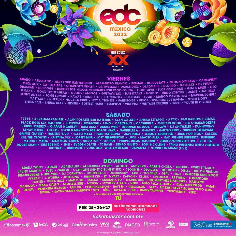 El principal festival de música electrónica de México, EDC (Electric Daisy Carnival), hoy se encuentra de plácemes tras anunciar sus más de 192 actos en vivo, que se podrán disfrutar en su edición 2022. Es así que los amantes al EDM, house, dance, electro, drum and bass, techno, dance-punk, hard dance, dubstep, trance y más, enloquecerán con la presencia de los mejores y más importantes exponentes del género como Deadmau5, Boris Brejcha, Carl Cox, Maceo Plex, Dubfire b3b Nicole Moudaber b3b Paco Osuna, DJ Snake, The Chainsmokers, Alesso, Grimes, Dimitri Vegas & Like Mike, Zedd, y muchos más, quienes serán los responsables de encender los ánimos de los miles de “headliners” que se den cita los próximos 25, 26 y 27 de febrero de 2022 en el Autódromo Hermanos Rodríguez.