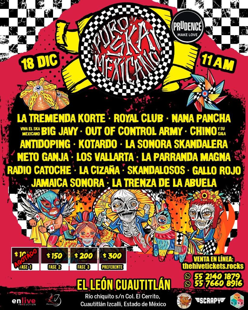Enlive production y L Producciones presentan en el marco del Festival “Puro Ska Mexicano Vol. 1” a lo mejor de la escena mexicana del ska en El León de Cuautitlán, ubicado a 10 minutos de la estación del Tren Suburbano Cuautitlán y a 2 minutos de la Autopista México-Querétaro, en el marco de la primera edición que se llevará a cabo este Sábado 18 de Diciembre y que reúne lo mejor de la escena prometiendo que en próximas fechas será lo mejor de la escena internacional. En este encuentro que ha sumado lo mejor de la vieja y la nueva ola del género, La Tremenda Korte, Nana Pancha, Royal Club, Out of Control Army, Antidoping, Kotardo, La Sonora Skandalera, Radio Catoche. Neto (de Ganja), La Parranda Magna, La Cizaña, Los Skandalosos, Gallo Rojo, Jamaica Sonora y La Trenza de la Abuela harán de esta una verdadera fiesta.
