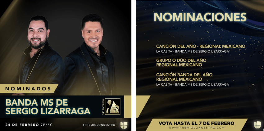 Este 2022 la BANDA MS DE SERGIO LIZÁRAGA lo inicia con importantes noticias, la primera de ellas son estas nominaciones que seguramente seran el inicio de muchas de las cosas positivas que están por venir.