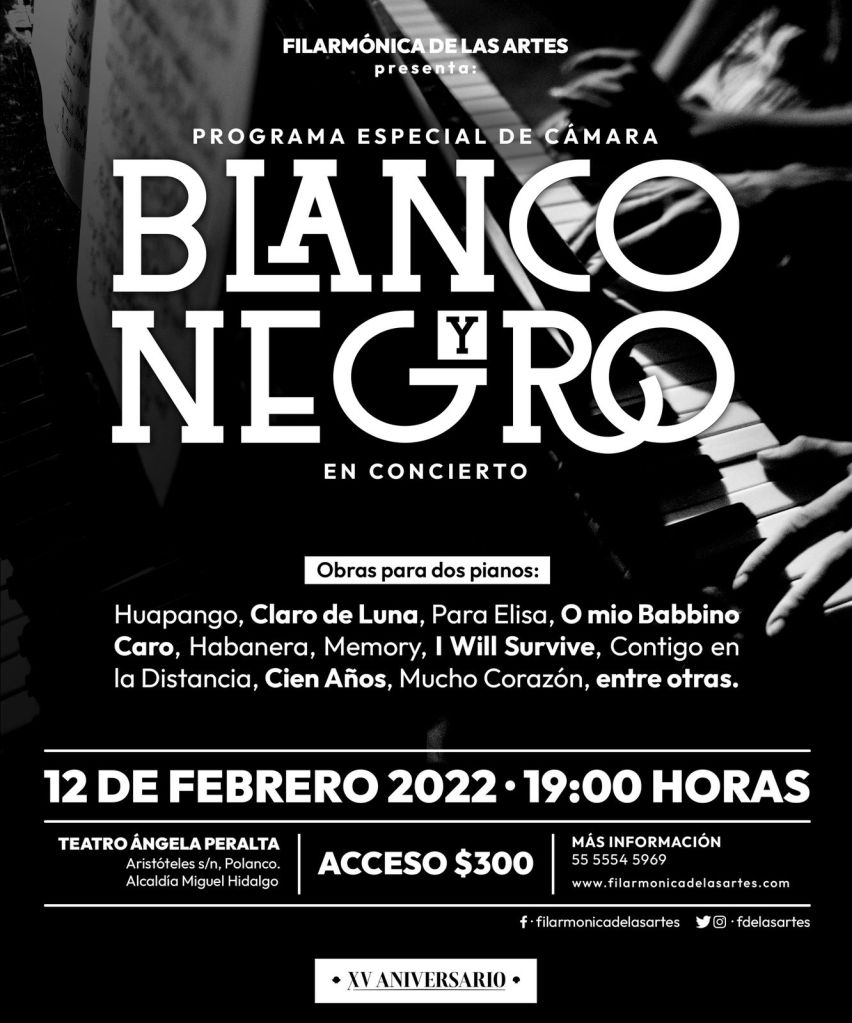 A la Filarmónica de las Artes la ha caracterizado siempre la manera en cómo celebra las fechas especiales de forma mágica, creando y siempre con un apapacho a través de su música para con sus diversos tipos de audiencia de forma profesional y con su sello que los caracteriza, esta ocasión, el día de San Valentín, no es la excepción, el sábado 12 de febrero en el Teatro Ángela Peralta de la Ciudad de México se podrá presenciar por primera vez «Blanco y Negro en concierto» un espectáculo en formato de cámara, con música a dos pianos.