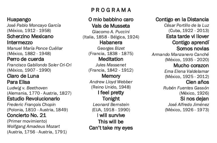 El repertorio abarca diferentes géneros como música clásica, popular, comercial, entre otros; se incluirán algunas de las siguientes obras: Huapango de J. P. Moncayo, Intermezzo de M. M. Ponce, Claro de Luna y Para Elisa de L. v. Beethoven, O mio Babbino Caro, Habanera de la ópera Carmen, Memory del musical Cats, I will survive, This will be y temas mexicanos de compositores como Francisco Gabilondo Soler Cri-Cri, Emma Elena Valdelamar, Armando Manzanero y José Alfredo Jiménez, entre otros.