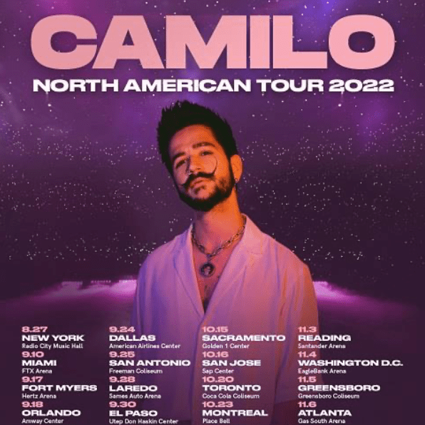 El aclamado cantautor cinco veces ganador del Latin GRAMMY® y dos veces nominado al GRAMMY® Camilo anuncia su próxima gira Camilo -North American Tour 2022.Presentado por la compañía de espectáculos Loud And Live, esta gira se emprenderá a partir del27 de agosto en Radio City Music Hall de Nueva York, y seguirá hasta noviembre llegando a importantes ciudades como Miami, Houston, Dallas, Los Ángeles, Chicago, Boston, Atlanta, Toronto y Puerto Rico, entre otras.