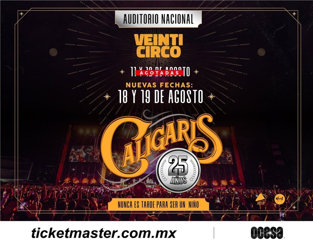 Debido a la gran demanda de sus fans, Los Caligaris añaden dos conciertos más en el Auditorio Nacional de su gira Veinticirco, el show más importante de su carrera que celebra su primer cuarto de siglo. Las nuevas fechas confirmadas son el 18 y 19 de agosto de 2022; podrás adquirir tus entradas en la Preventa Citibanamex el 6 y 7 de abril o, un día después en la taquilla del inmueble y a través de www.ticketmaster.com.mx.