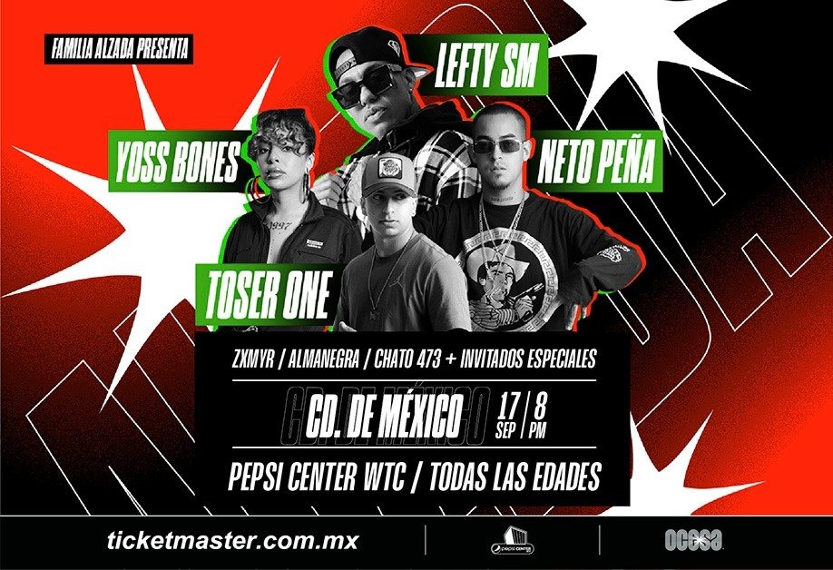 La Familia Alzada calienta motores para armar la fiesta urbana más importante del Pepsi Center WTC el próximo 17 de septiembre. La alineación de lujo consiste en Yoss Bones, Toser One, Lefty Sm, Neto Peña, Zxmyr, Almanegra, Chato 473 y más invitados que encenderán con su flow a la Ciudad de México.