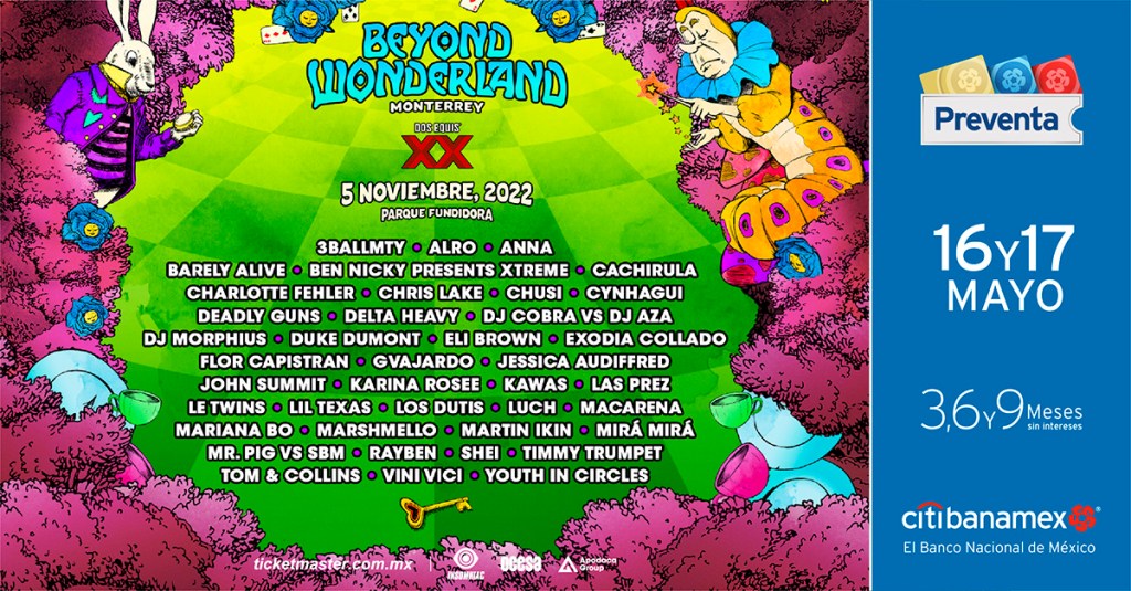 ¡Todos a bordo! El viaje hacia la Madriguera del Conejo comienza y hoy, Insomniac, OCESA y Apodaca Group, anuncian el cartel con los diversos artistas que guiarán el camino en Beyond Wonderland Monterrey, el festival más alucinante de México que se llevará a cabo el sábado 5 de noviembre en el Parque Fundidora, donde se presentará lo mejor del talento local y mundial. Asegura tu lugar en el viaje y adquiere tus entradas en la Preventa Citibanamex el 16 y 17 de mayo, o un día después en las taquillas del inmueble y a través de la red Ticketmaster en la venta general.