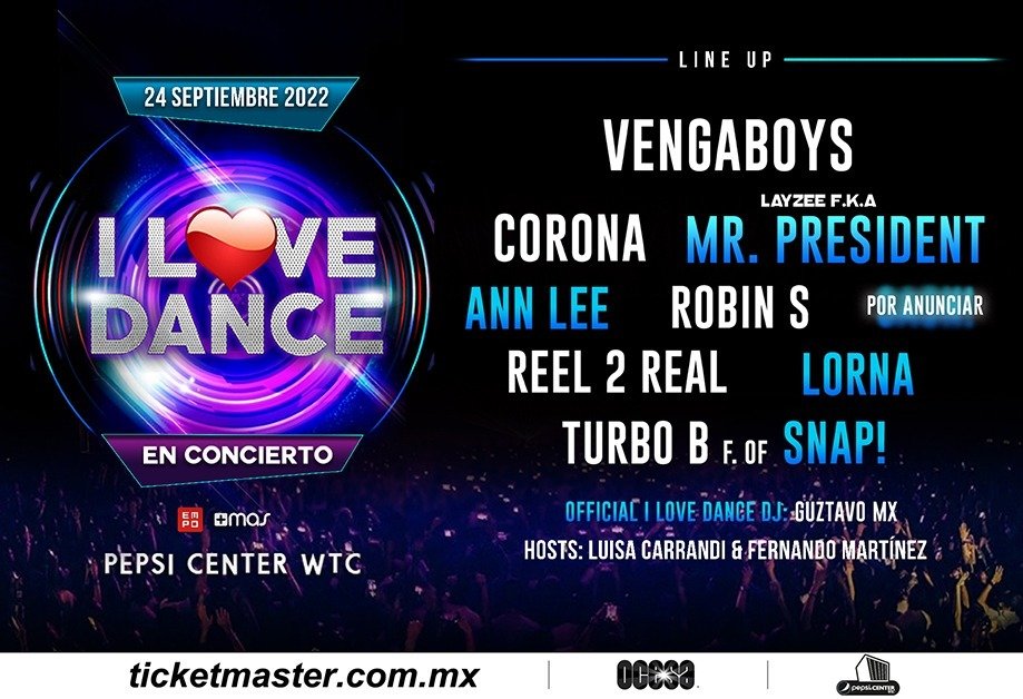 VENGABOYS, CORONA, LAYZEE FKA MR. PRESIDENT, ANN LEE, ROBIN S, REEL 2 REAL, LORNA, TURBO B F. OF SNAP! Y UN ARTISTA MÁS POR ANUNCIAR en compañía del DJ Gustavo MX, serán los encargados de llevarnos a aquellos años de gloria. Además, I LOVE DANCE tendrá como hosts a Luisa Carrandi y Fernando Martínez.