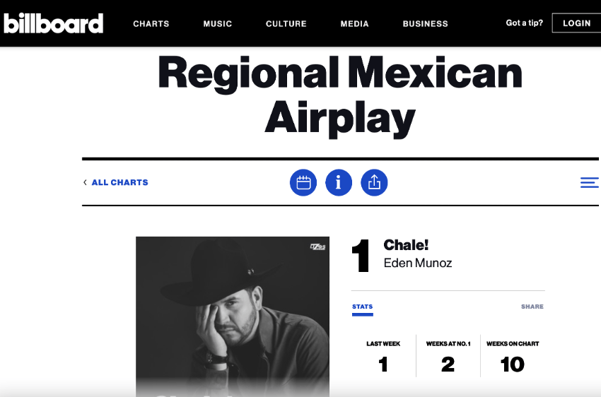 POR SEGUNDA SEMANA CONSECUTIVA EDEN MUÑOZ CON “CHALE” No. 1 EN BILLBOARD
