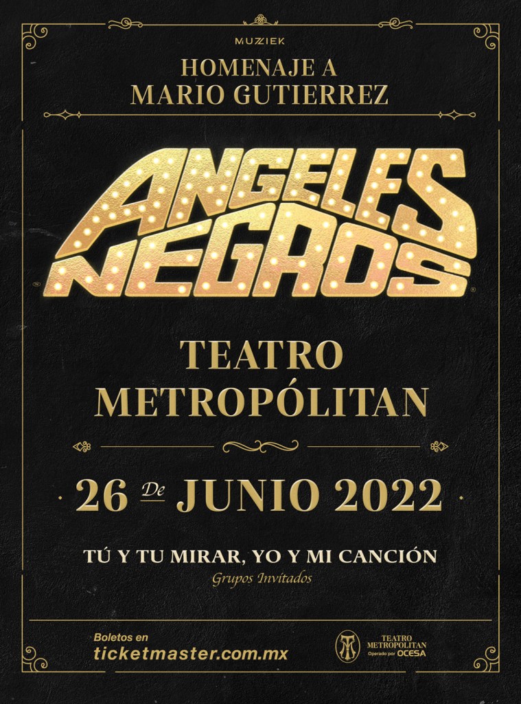 Angeles Negros es el epíteto de excelencia de un grupo incombustible que ha logrado alcanzar la madurez en plenitud y calidad tras más de cinco décadas de trayectoria y que exhibirá una parte de ese enorme legado el próximo Domingo 26 de Junio de 2022 a partir de las seis de la tarde en el Teatro Metropólitran para homenajear a Mario Gutiérrez al lado de grandes figuras y amigos. Boletos a la venta en el Sistema Ticketmaster y en taquillas del inmueble.