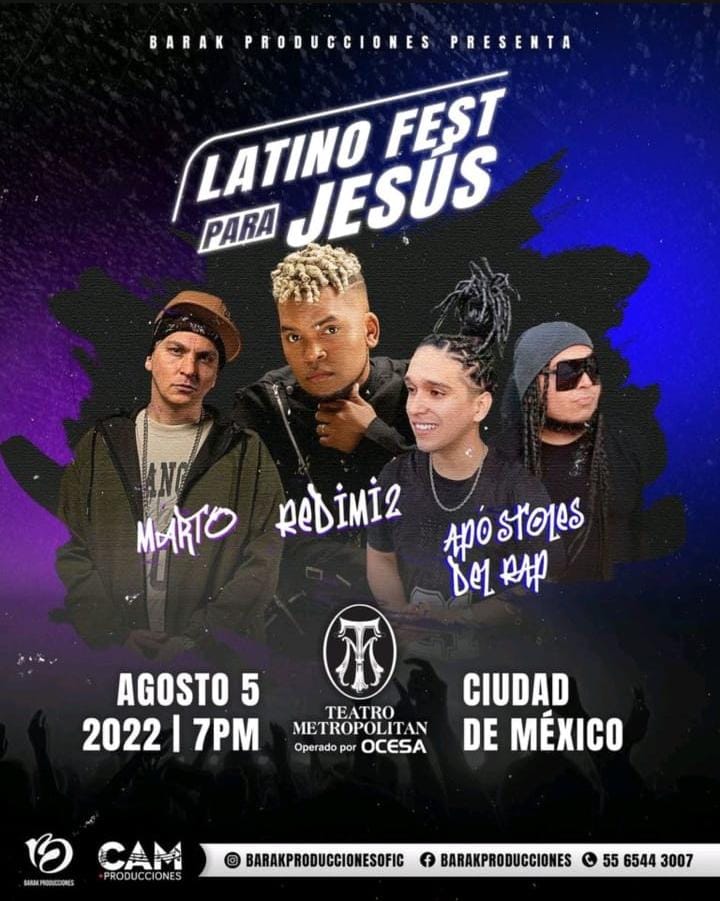 Encabezado por el mexicano Marto, el dominicano Redimi2 y por los también mexicanos Apóstoles del Rap, el Festival Latino Fest para Jesús se llevará a cabo el próximo Viernes 05 de Agosto en el Teatro Metropólitan, donde a partir de las siete de la noche estos artistas desfilarán por el escenario poniendo muy en alto los ritmos urbanos y listos para hacer pasar una tarde agradable a su amplia fanaticada. Los boletos se encuentran a la venta en el Sistema Ticketmaster y en taquillas del inmueble.