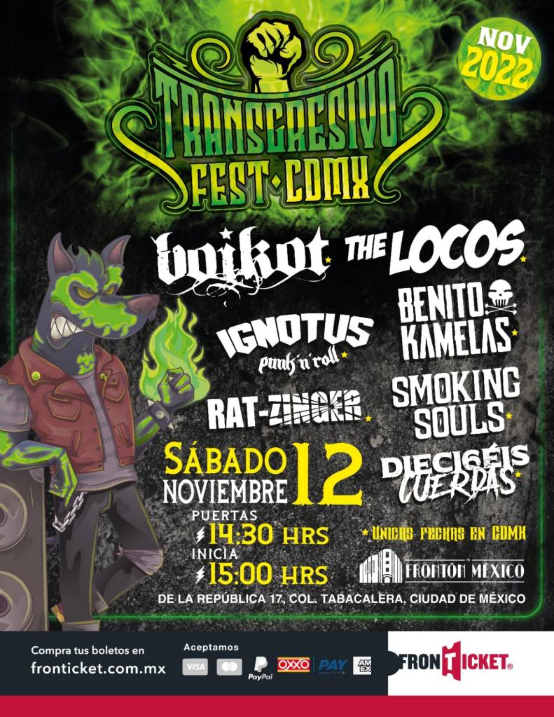 Una gran noticia cimbra a los amantes del rock, el ska, el punk, el hard core y ritmos afines: el Transgresivo Fest está de regreso. Con su mística y su apuesta de presentar a lo mejor de la escena ibérica del rock duro, este año la exitosa y bien acreditada promotora Perro Verde se ha lucido presentando a grandes grupos que en Europa están considerados como protagonistas de la escena y que por vez primera se acercan a territorio mexicano para contagiar al público de su buen accionar en directo. Es así que Boikot, The Locos, Rat-Zinger, Benito Kamelas, Smoking Souls y Dieciséis Cuerdas están listos para hacer una única presentación exclusiva en la Ciudad de México en el reconocido Frontón México el Sábado 12 de Noviembre a partir de las 14:30 hrs con boletos a la venta en el Sistema FronTicket en https://fronticket.boletosenlinea.events/eventperformances.asp?evt=767 y en puntos de venta autorizados a un costo de $800.00.