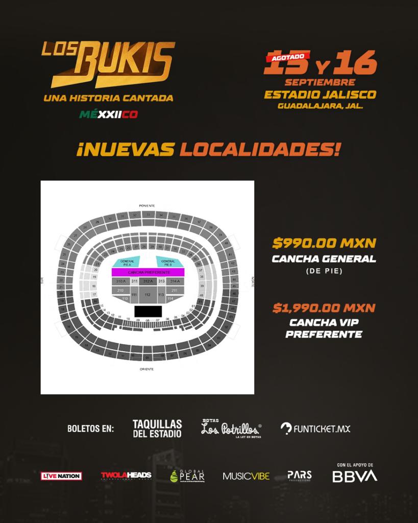 Los Bukis regresan a México y exhortan a su público para no perderse la oportunidad de verlos en vivo POR ÚLTIMA VEZ en esta gran despedida el Jueves 15 (boletos agotados en esta fecha) y Viernes 16 de Septiembre estarán presentándose en el Estadio Jalisco. Se han abierto nuevas localidades que son Cancha General (de pie) a un costo de $990.00 el boleto y Cancha VIP Preferente a un costo de $1,990.00. Boletos a la venta en Botas Los Potrillos, el Sistema funticket.mx y en taquillas del estadio.