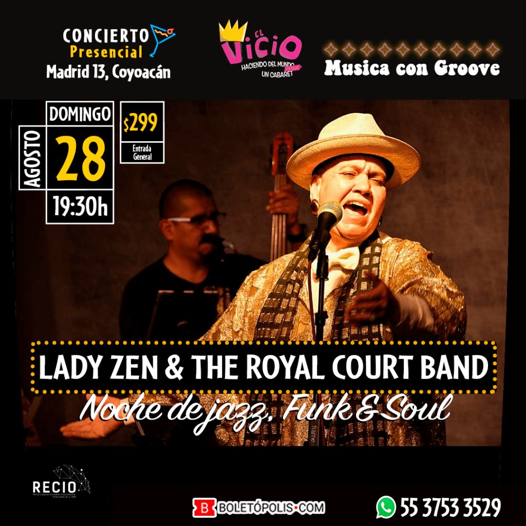 Con todo ello, Lady Zen es una show-woman ávida amante de la música con Groove y una académica poeta, compositora y arreglista que ha actuado en: Ámsterdam, París, Canadá, México, Brasil y en todo EU, lugares en los que se ha consumado con una marca única. El teatro bar El Vicio (calle Madrid 13, colonia Del Carmen, Coyoacán) te espera este domingo, a las 19:30Hrs para que formes parte de esta inolvidable experiencia musical, adquiere tus accesos en https://boletopolis.com/es/evento/23545, con un costo de 299 pesos, y déjate envolver por la voz y presencia de esta inigualable cantante de talla internacional, Lady Zen, y su toque único de interpretación, emoción, sentimiento y pasión musical; acompañada en el escenario por Armando Cuevas, Raúl Vallejo, Fernando Harada y Emanuel Chopis.