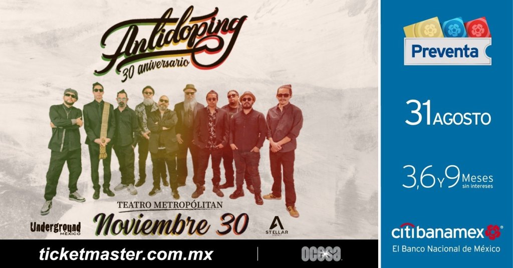 ¡Estamos de fiesta! Ya son 30 años de Antidoping, una de las bandas de reggae más prolíficas en México que, para celebrar su amplia trayectoria, ofrecerán un concierto inolvidable en el Teatro Metropólitan el próximo 30 de noviembre. Sé parte de la celebración y adquiere tus entradas en la Preventa Citibanamex el 31 de agosto a través de www.ticketmaster.com.mx.