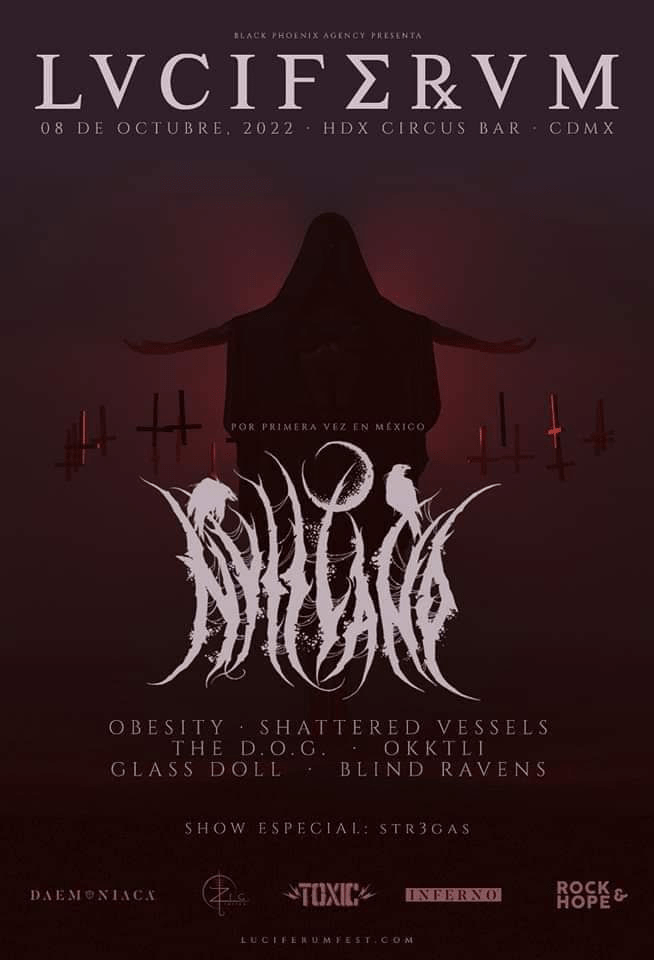 Luciferum se llevará a cabo en el HDX Circus Bar este Sábado 08 Octubre de 2022 a partir de las 19:30 hrs con la presencia de Nytt Land, The Dick of God, Blind Ravens, Shattered Vessels, Okktli y Obesity. Boletos ya están a la venta a través del Sistema Boletópolis en https://bit.ly/luciferumfestival22