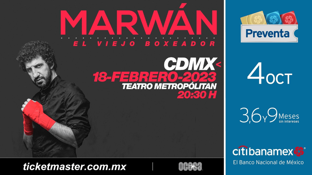 Este 2023 sé parte de uno de los conciertos más emotivos y esperados en la CDMX. El próximo 18 de febrero, el Teatro Metropólitan recibirá a Marwán con todos sus grandes éxitos. Los boletos estarán a la venta en preventa Citibanamex el 4 de octubre y, un día después los podrás adquirir en las taquillas del inmueble y a través de www.ticketmaster.com.mx.