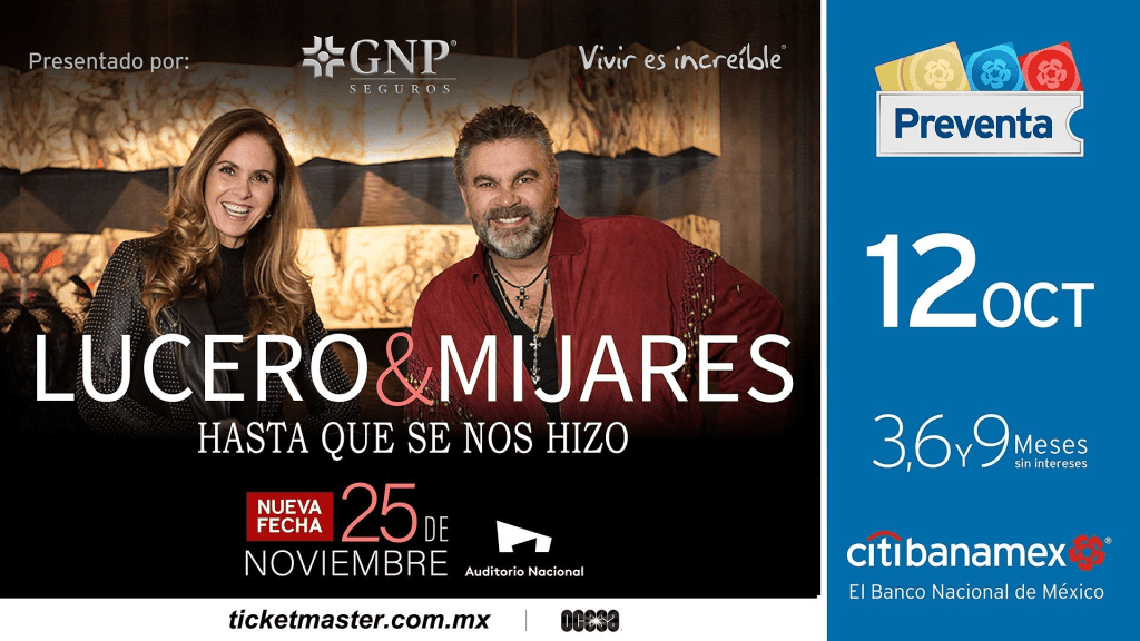 Por cuarta ocasión Lucero y Mijares llegarán juntos al Auditorio Nacional con un show lleno de éxitos, recuerdos y momentos divertidos como sólo ellos lo saben hacer. Los boletos estarán en disponibles en preventa Citibanamex el 12 de octubre, y un día después los podrás adquirir en las taquillas del inmueble o a través de www.ticketmaster.com.mx.