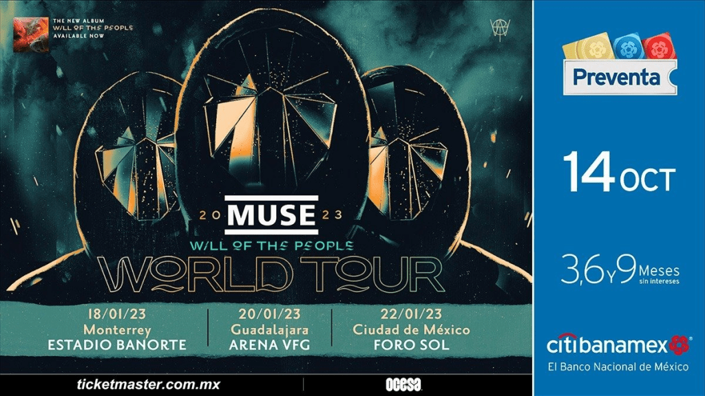 Los boletos para el regreso de Muse a México estarán disponibles en Preventa Citibanamex el 14 de octubre a través de la Red Ticketmaster, mientras que la venta general comenzará al día siguiente.
