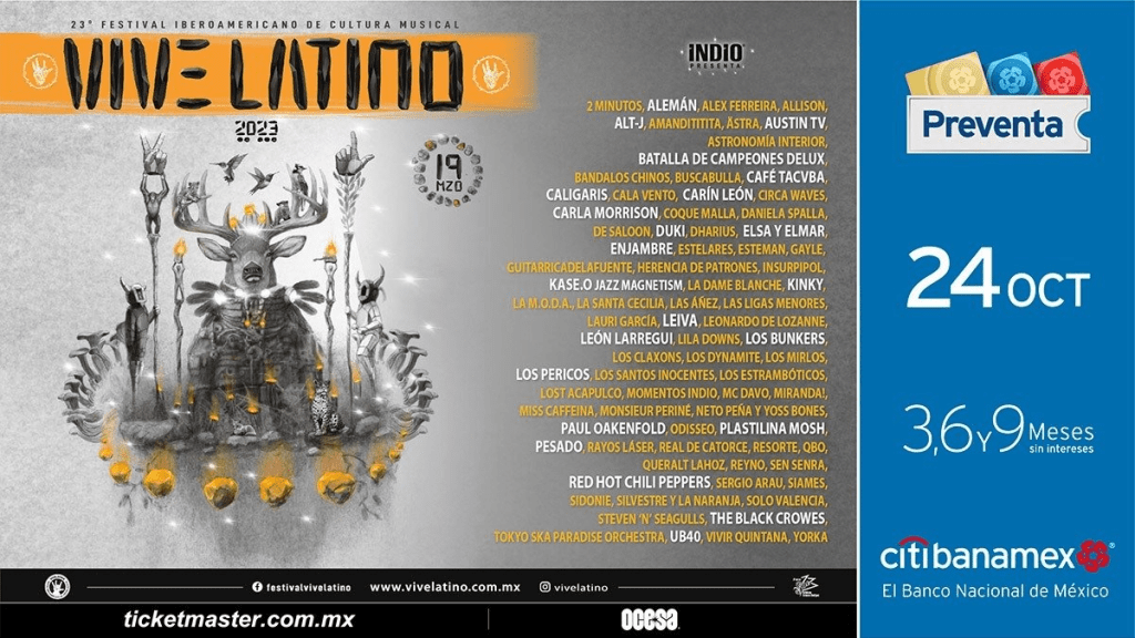 Este año el line up nos trae a grandes leyendas del rock nacional e internacional, nuevas promesas y corrientes musicales y se muestra a la vanguardia con exponentes de los nuevos géneros en Latinoamérica. Con esta combinación el festival es el encargado de reunir a todas las culturas del mundo a grito de ¡Vive Latino! los próximos 18 y 19 de marzo de 2023: