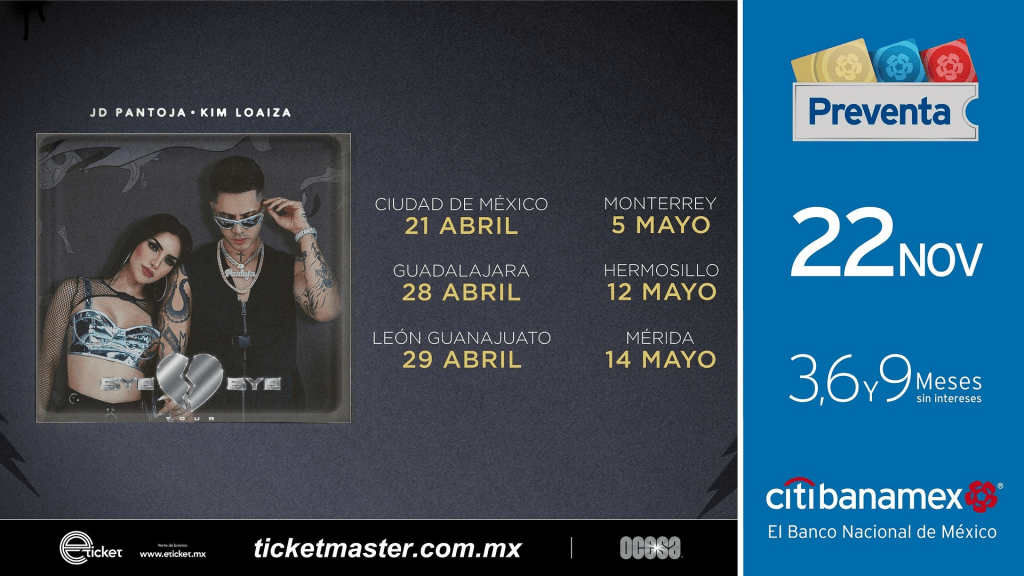 Kim Loaiza y JD Pantoja, la pareja más candente de internet y dos de los cantantes más populares del momento, anuncian nuevas fechas de su tour BYE BYE por el país para poner a bailar a todos sus fans hasta el cansancio. Las entradas estarán disponibles en Preventa Citibanamex el 22 de noviembre a través de Ticketmaster para Ciudad de México, Guadalajara y Monterrey, y por Eticket para el resto de las ciudades. Esta es la lista de ciudades que visitarán: