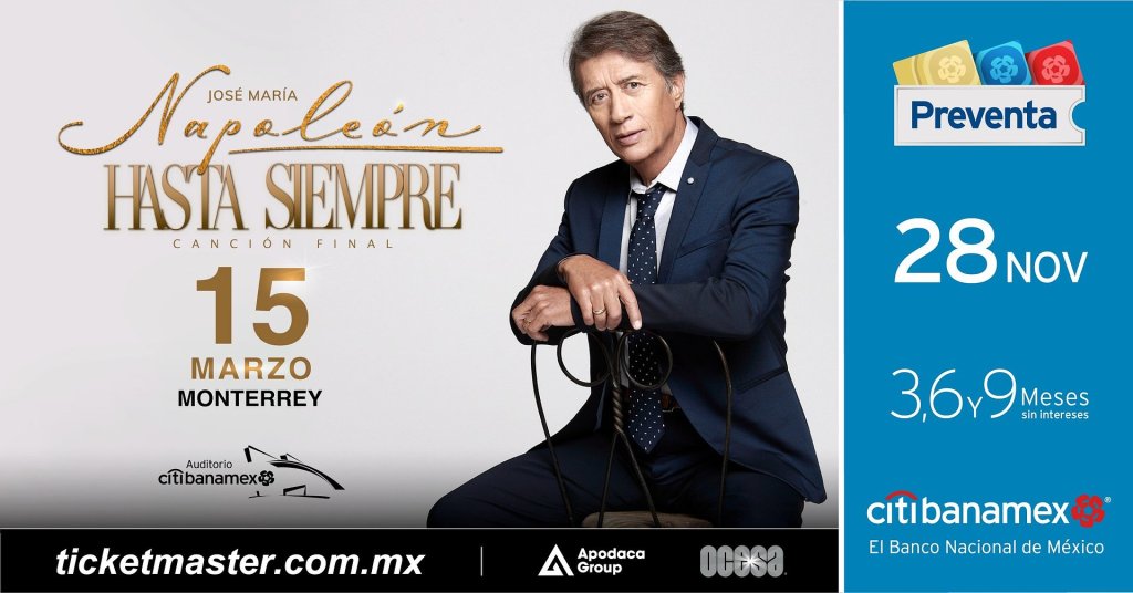Jose María Napoleón confirma una fecha más para marzo del siguiente año en Monterrey y Guadalajara, donde se despedirá como los grandes con su gira Hasta Siempre, después de dos conciertos con boletaje agotado en cada ciudad. Será el 15 de marzo en el Auditorio Citibanamex y el 16 de marzo en el Auditorio Telmex,cuando el aclamado artista celebre el legado de su amplia trayectoria. Adquiere tus boletos en la Preventa Citibanamex el 28 de noviembre través de la Red Ticketmaster.