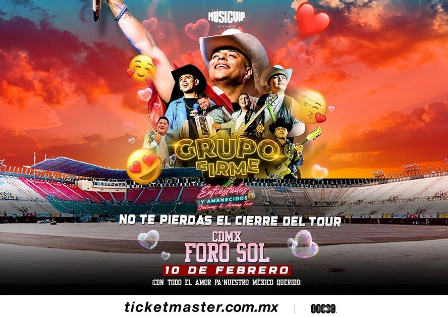 GRUPO FIRME (así en mayúsculas) es la agrupación de regional mexicano más escuchada en el mundo actualmente. Su éxito no sería posible sin su amado público, a quienes hoy complacen con la noticia de un nuevo concierto para cerrar su exitosa gira Enfiestados y Amanecidos, que tendrá lugar en el Foro Sol de la CDMX el próximo 10 de febrero de 2023. No te quedes fuera de esta fiesta y adquiere tus boletos el 16 de diciembre en la Preventa Citibanamex o, a partir del 17 de diciembre en la venta general.
