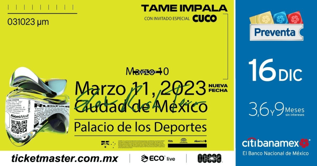¡Segunda dosis de Rushium! Tame Impala, con The Slow Rush Tour, confirma su esperado regreso a la Ciudad de México para dar DOS conciertos alucinantes en el Palacio de los Deportes, producidos por OCESA y ECO Live. La cita es el 10 (boletos agotados) y 11 de marzo (¡nueva fecha!) de 2023 con un invitado muy especial: Cuco. Adquiere tus entradas para la nueva fecha este viernes 16 de diciembre en la Preventa Citibanamex por medio de la Red Ticketmaster o un día después en la venta general.