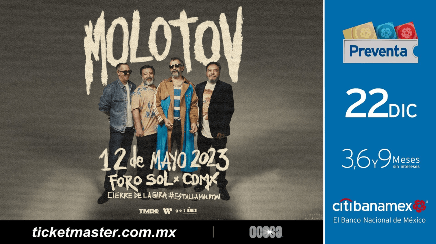 La molocha, la banda icónica del rock en español, la agrupación más poderosa de México, o como los quieras llamar. Tito, Miky, Randy y el Paco, estarán de vuelta en la capital chilanga el próximo 12 de mayo de 2023 ni más ni menos que… ¡en el Foro Sol! Así es banda, donde tocan los más grandes. Además, los carnales de Molotov estarán festejando 27 años de carrera en este escenario tocado por los dioses.