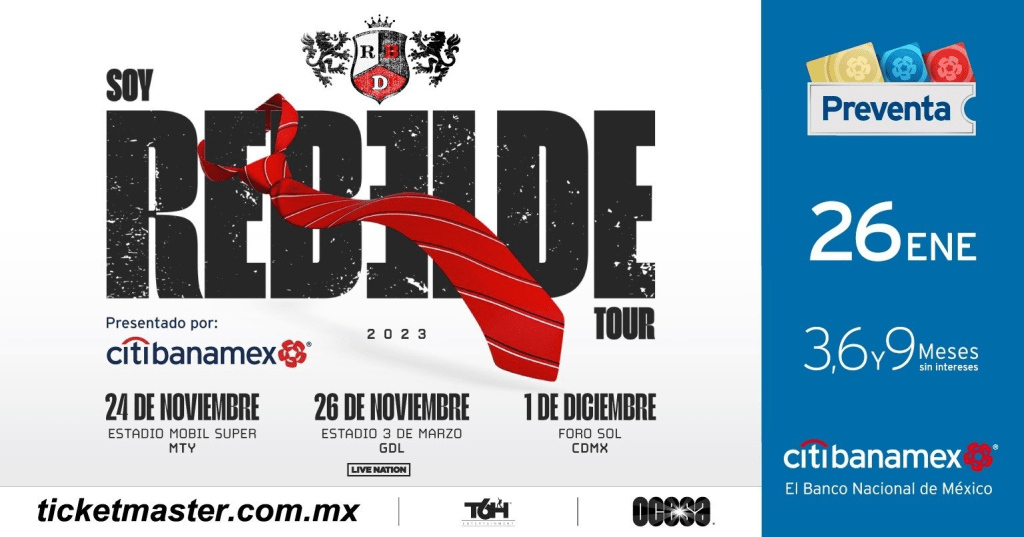 El fenómeno multigeneracional RBD —el cual continúa siendo el más relevante de la música y la cultura pop contemporánea— emprenderá una de las giras más esperadas de la historia para celebrar un legado de 20 años de música, producida por T6H Entertainment, Live Nation y OCESA. La gira visitará 26 de las ciudades más importantes en Estados Unidos, México y Brasil, que incluirá conciertos en 10 estadios y 18 arenas; esperando un total de 700 mil fans quienes presenciarán este momento único e irrepetible. La Preventa Citibanamex para los conciertos en Monterrey, Guadalajara y Ciudad de México estará disponible a partir del 26 de enero a las 2:00 pm hora local por medio de la Red Ticketmaster. Los boletos para cada una de las fechas saldrán a la venta al público en general el 27 de enero a las 2:00 pm en México a través de Ticketmaster.