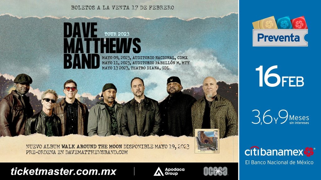 Dave Matthews Band arrancará su gira con tres fechas en México: primero en el Auditorio Nacional de la Ciudad de México el 9 de mayo, después en el Auditorio Pabellón M de Monterrey el 11 de mayo y, por último, en el Teatro Diana de Guadalajara el 13 de mayo.