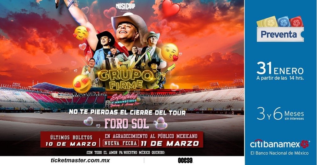 Grupo Firme anunció hoy el último concierto en el Foro Sol para el 11 de marzo de 2023, como parte del gran cierre del exitoso tour Enfiestados y Amanecidos. Hasta el momento, la agrupación de regional mexicano es la única en lograr siete conciertos en el Foro Sol como parte de una misma gira, la cual cerrarán con broche de oro en agradecimiento a su amado público mexicano. No te quedes fuera de esta gran fiesta y adquiere tus boletos el 31 de enero en la Preventa Citibanamex o, a partir del 1 de febrero en la venta general.