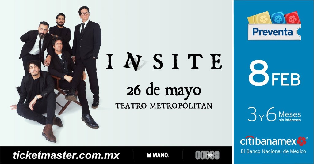 INSITE, está listo para reconquistar a todo su público y darnos una dosis de nostalgia, acompañada con lo nuevo que nos tienen preparado. No te pierdas del regreso de esta banda el próximo 26 de mayo en el Teatro Metropólitan. Los boletos estarán en preventa Citibanamex el 8 de febrero, y un día después los podrás adquirir en las taquillas del inmueble o a través de www.ticketmaster.com.mx.