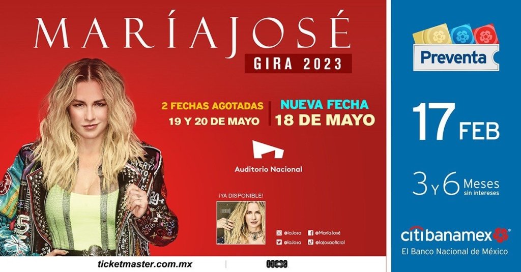 María José sigue rompiendo récords y colocándose como una de las artistas más importantes del momento. La cantante regresa por tercera ocasión al Auditorio Nacional el 18 de mayo; y después, estará nuevamente en el Auditorio Telmex el 26 de mayo. Adquiere tus boletos para ambas ciudades en preventa Citibanamex el 17 de febrero, y un día después los podrás adquirir en las taquillas del inmueble o a través www.ticketmaster.com.mx.