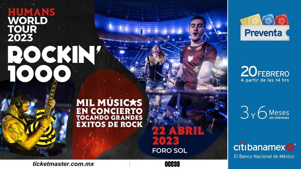 Ciudad de México, prepárate para darle vida a una de las experiencias musicales más importantes del mundo: Rockin’1000. Por primera vez en nuestro país, alrededor de más de 1,000 músicos se unirán en un solo escenario para cantar e interpretar las canciones más icónicas del rock. No te pierdas este gran evento y adquiere tus boletos en preventa Citibanamex el 20 de febrero, y un día después los podrás adquirir en las taquillas del inmueble o a través de www.ticketmaster.com.mx.