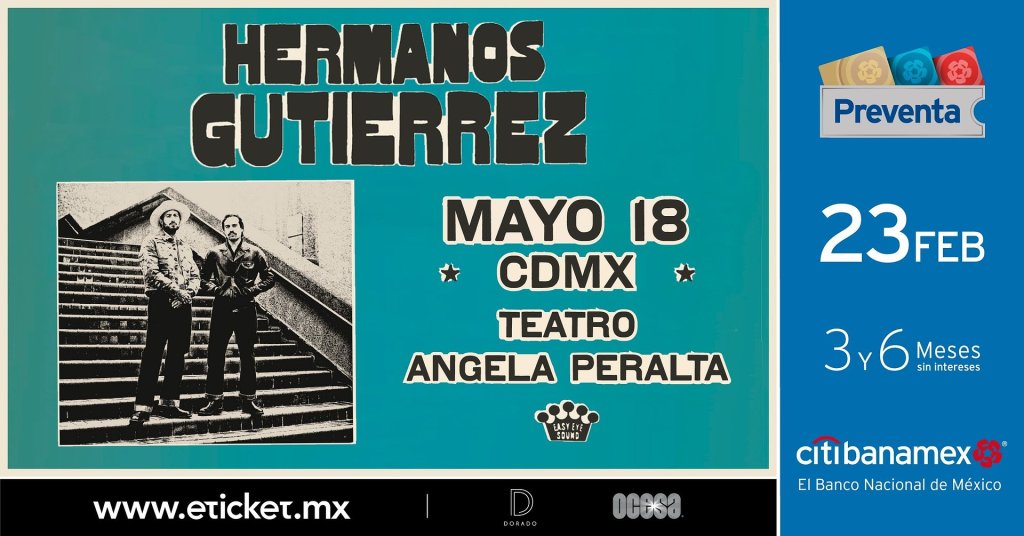 Las exquisitas melodías del dúo suizo de ascendencia ecuatoriana, Hermanos Gutiérrez, llegarán a la Ciudad de México para presentar su más reciente material discográfico lanzado en 2022: El Bueno Y El Malo; y no habrá mejor lugar para disfrutar su música que el Teatro al Aire Libre Ángela Peralta, el próximo 18 de mayo. Los boletos estarán disponibles el jueves 23 de febrero en la Preventa Citibanamex por medio de www.eticket.mx. La venta general comenzará el 24 de febrero.