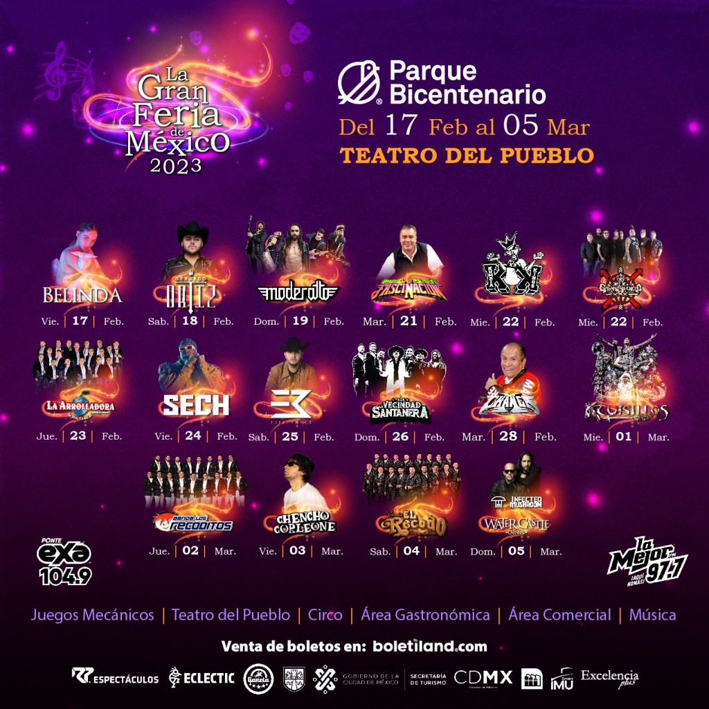 El segundo fin de semana de actividades de la Gran Feria de México cerrará con los actos principales de Edén Muñoz el sábado 25 de febrero y La Vecindad Santanera el domingo 26 de febrero. Para el tercer bloque de actividades se ofrecerán las presentaciones de Sonido la Changa el martes 28 de febrero, Cuisillos el miércoles 1 de marzo, Banda Los Recoditos el jueves 2 de marzo, Chencho Corleone el viernes 3 de marzo, El Recodo el sábado 4 de marzo, finalizando con Infected Mushroom y Water Castle el domingo 5 de marzo.