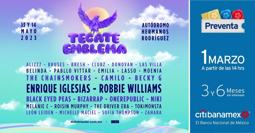 Es por eso que con orgullo y con la adrenalina a tope, te presentamos la segunda edición de TECATE EMBLEMA, un festival donde los prejuicios no existen y los estilos musicales conviven en un mismo escenario. Los próximos 13 y 14 de mayo nos reuniremos nuevamente en el Autódromo Hermanos Rodríguez, para disfrutar lo mejor de la música pop de varias épocas y todas sus vertientes.