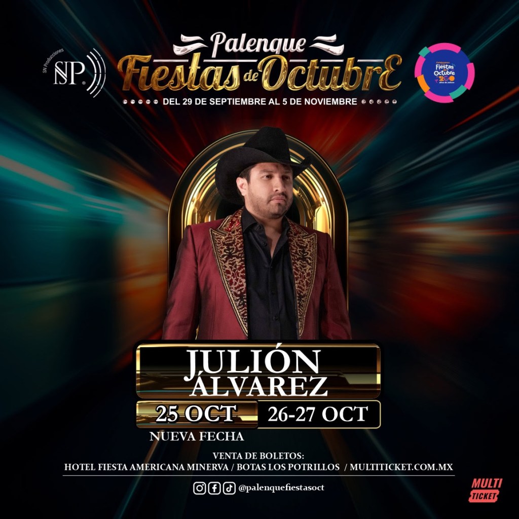 La semana pasada anunciamos la tercera fecha de “El rey de la taquilla”. Julión Álvarez se presentará el 25 de octubre, sumado así a las dos fechas que ya tenía del 26 y 27 del mismo mes.