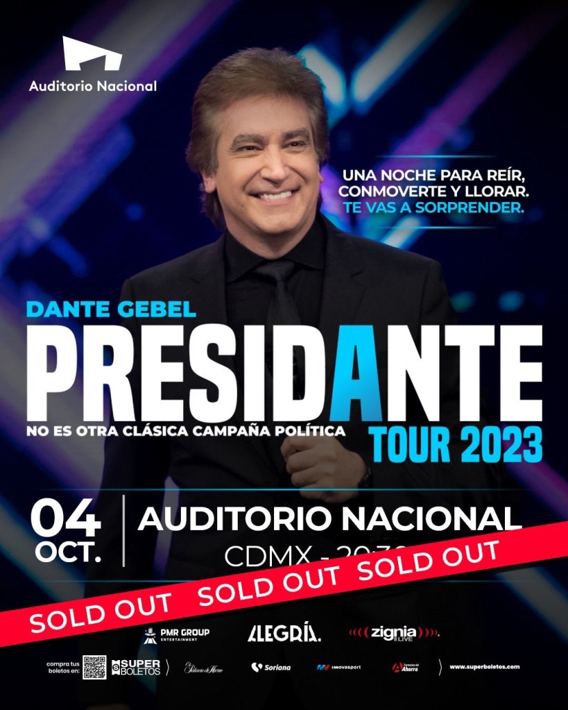 PRESIDANTE Tour 2023 de Dante Gebel es oficialmente sold out el día de hoy en el Auditorio Nacional. Publicado el 4 octubre, 2023 por Fernando Avalos Deja un comentario Compártelo: Haz clic para compartir en X (Se abre en una ventana nueva) X Haz clic para compartir en Facebook (Se abre en una ventana nueva) Facebook Me gusta Cargando... Sin categoría
