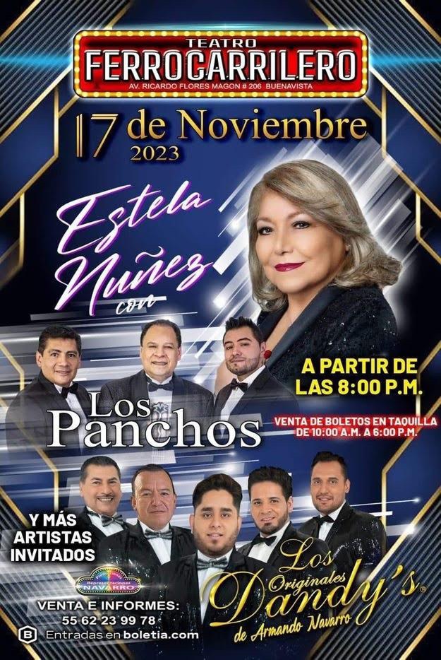 Este 17 de noviembre, la legendaria agrupación Los Dandy’s, liderada por Ana María Navarro, promete ofrecer un espectáculo inolvidable en el Teatro Ferrocarrilero, junto a los destacados artistas Estela Nuñez y Los Panchos. Boletos a la venta en el Sistema Boletia en https://estela-nunez-y-los-dandys-de-armando-navarro.boletia.com/ y en taquillas del teatro de 10am a 6pm